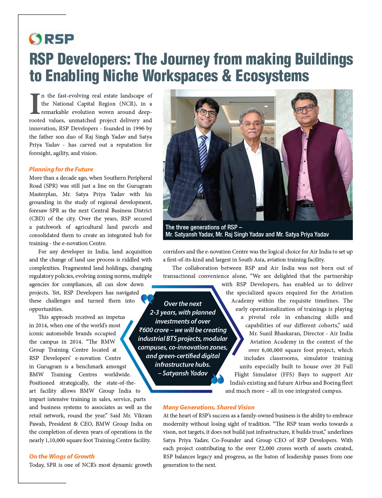 In the fast-evolving real estate landscape of the National Capital Region (NCR), in a remarkable evolution woven around deep-rooted values, unmatched project delivery and innovation, RSP Developers – founded in 1996 by the father son duo of Raj Singh Yadav and Satya Priya Yadav – has carved out a reputation for foresight, agility, and vision.